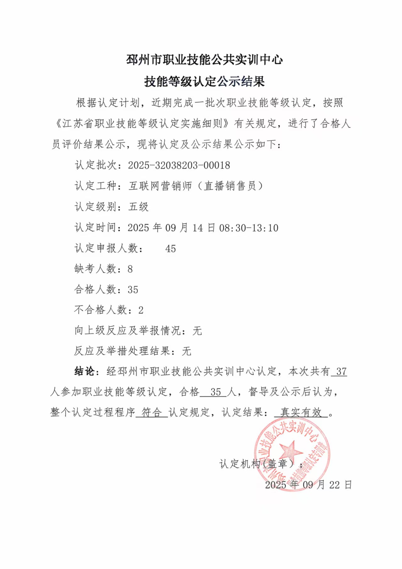 邳州市职业技能公共实训中心技能等级公示结果-2025.09.14上午【25-18】