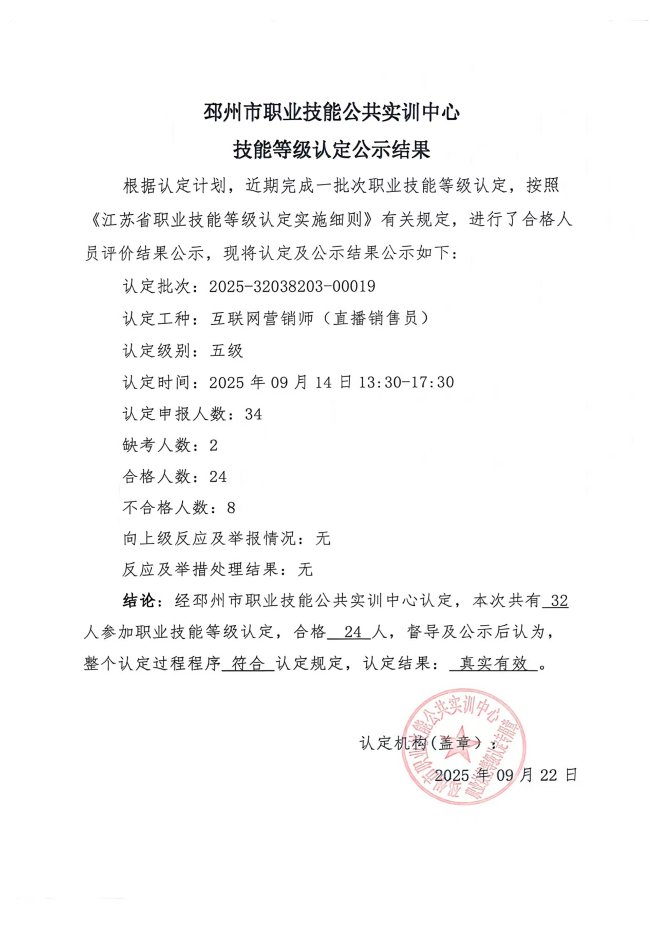 邳州市职业技能公共实训中心技能等级公示结果-2025.09.14下午【25-19】