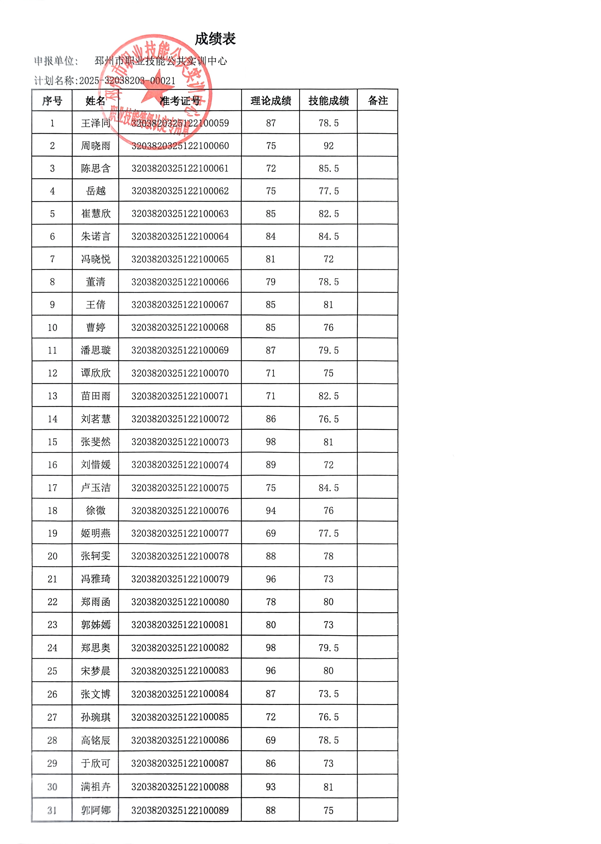 邳州市职业技能公共实训中心技能等级成绩公示-2025.12.21上午【25-21】