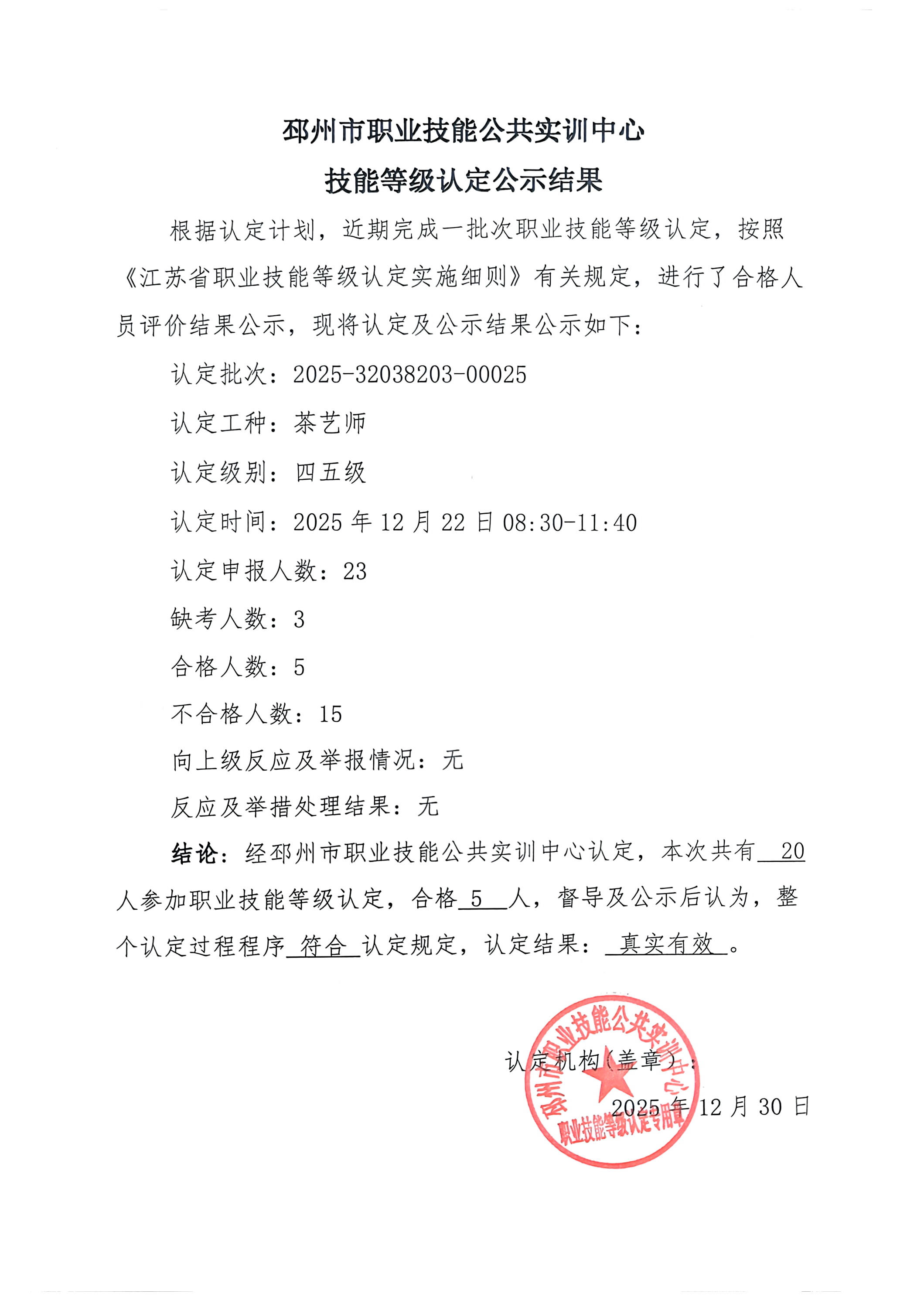 邳州市职业技能公共实训中心技能等级公示结果-2025.12.22上午【25-25】